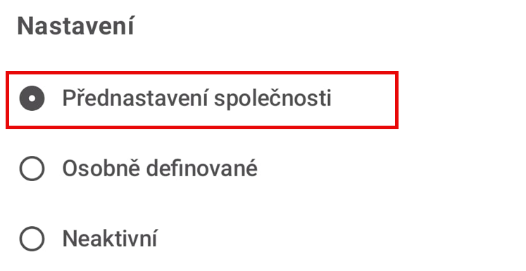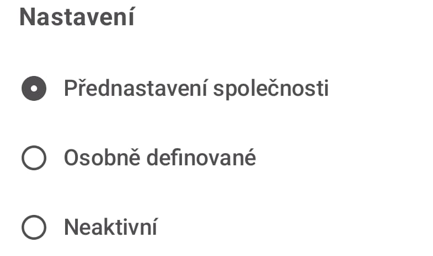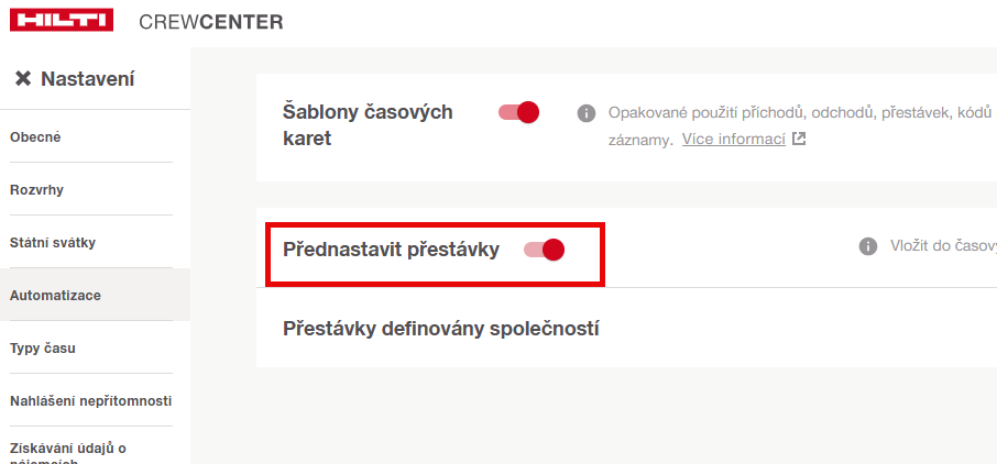 Dostupné pouze pokud administrátor nakonfiguroval firemní přestávky ve webovém rozhraní. Tyto přestávky jsou automaticky aplikovány všem uživatelům, kteří tuto možnost vyberou.