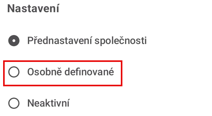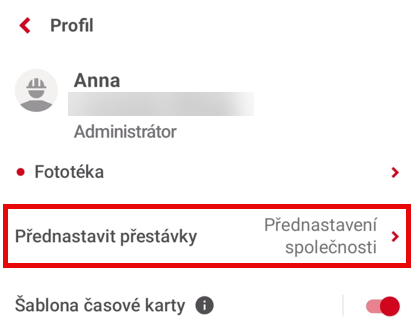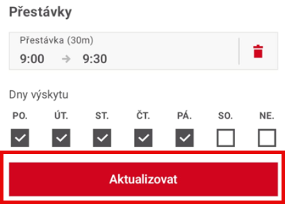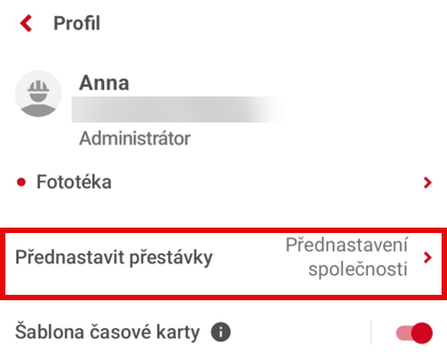 Jakékoli změny ve firemně definovaných přestávkách jsou v nastavení aplikace zvýrazněny červenou tečkou.