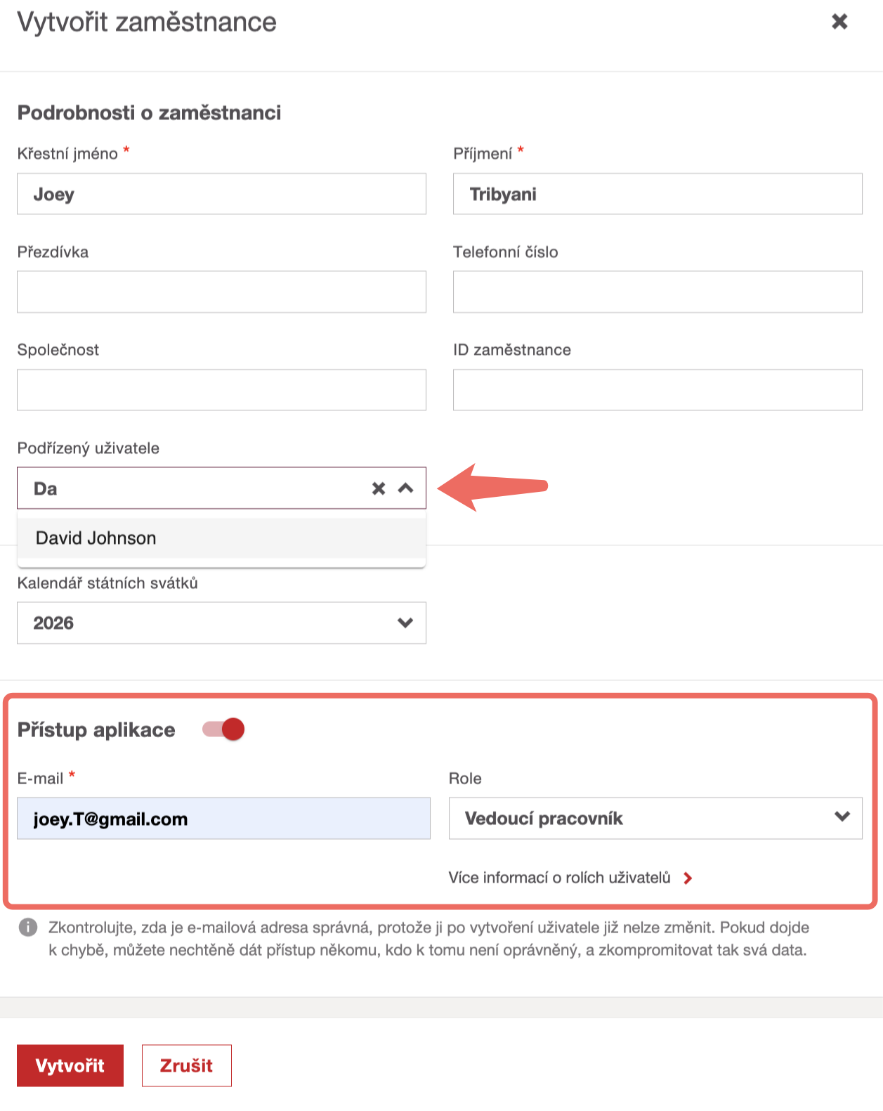 - Pokud chcete vytvořit zaměstnance s rolí „správce“ nebo „supervizor“, musíte vždy udělit „přístup k aplikaci“.