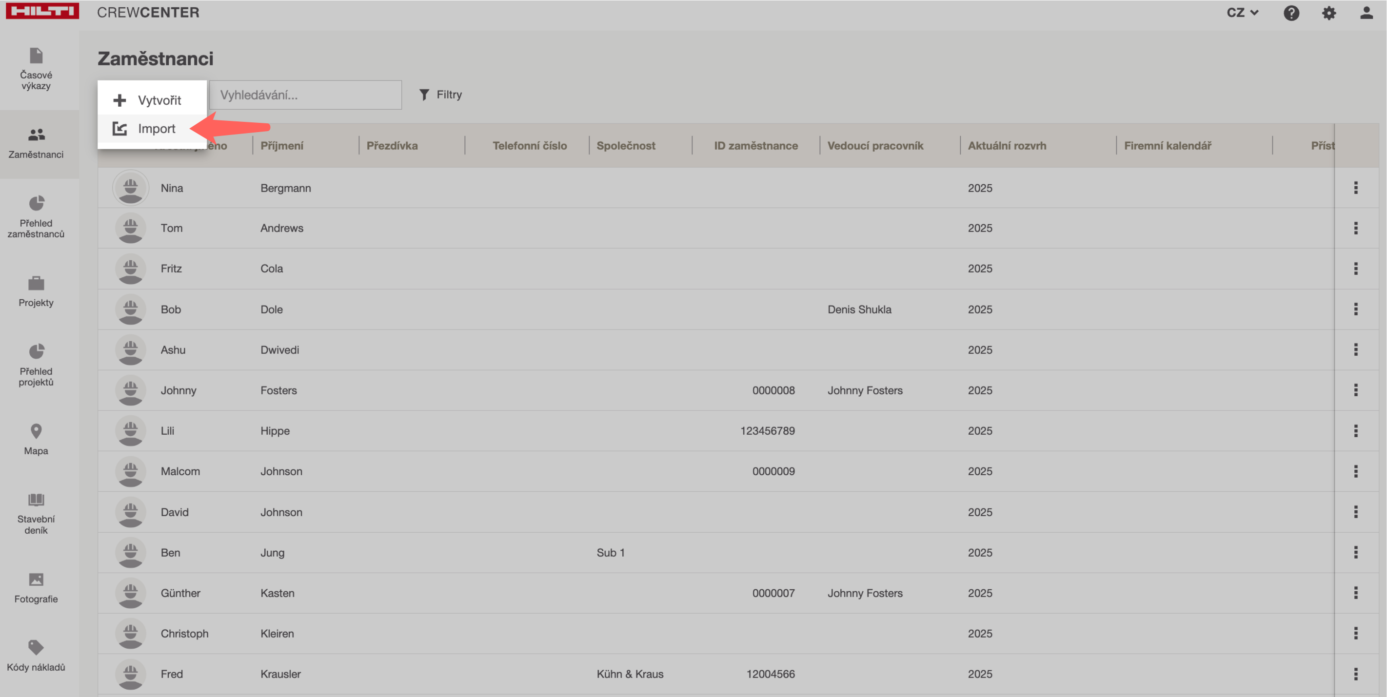 Import zaměstnanců pomocí souboru CSV
