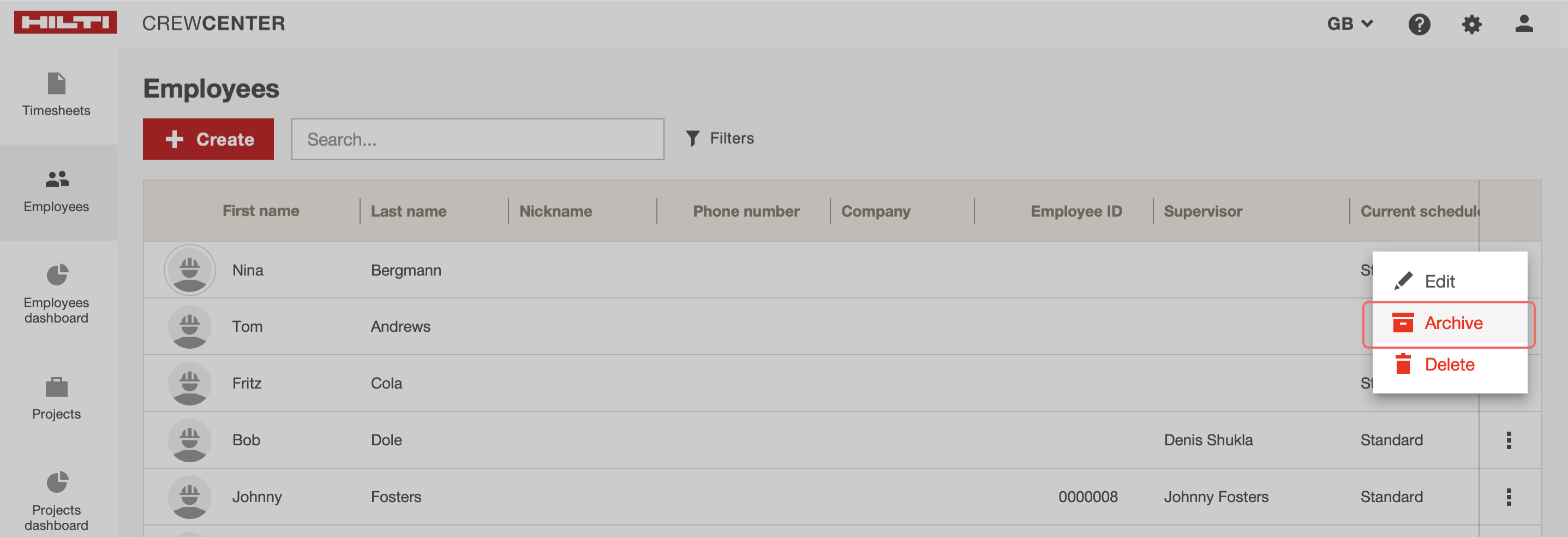 V rámci této funkce můžete označit určité zaměstnance jako „archivované“, aby byli skryti z většiny zobrazení a seznamů v systému. Tím se zaměstnanec ani jeho data neodstraní. Archivovat můžete kliknutím na tři tečky na pravé straně příslušného zaměstnance v záložce „Zaměstnanci“ a poté kliknutím na „Archivovat“.