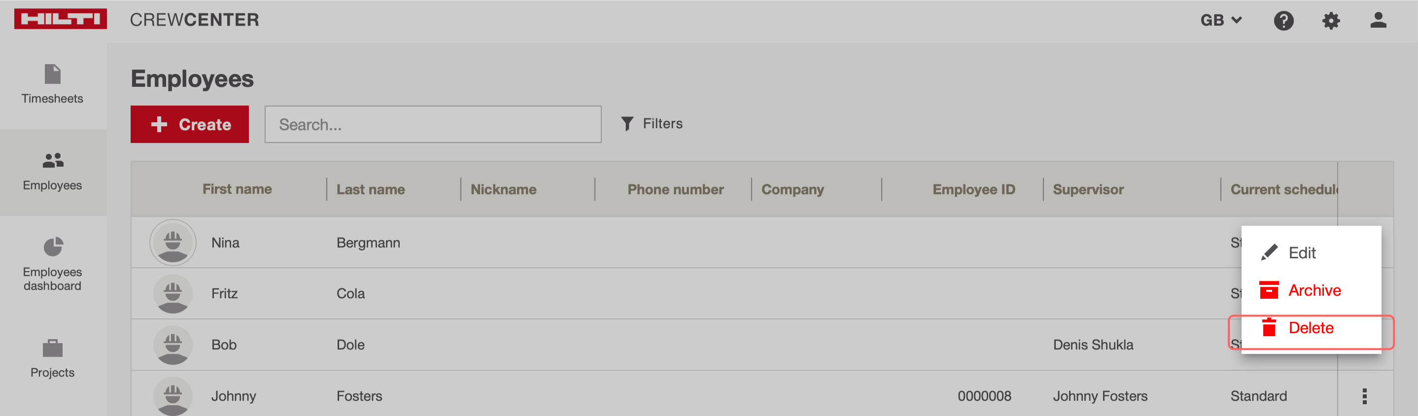 Na kartě „Zaměstnanci“ klikněte na tři tečky vpravo od příslušného zaměstnance a poté klikněte na „Smazat“.