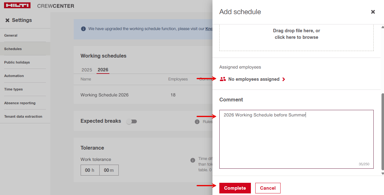 5. Přiřaďte zaměstnance k nahranému plánu, přidejte komentář (volitelné) a klikněte na Dokončit.