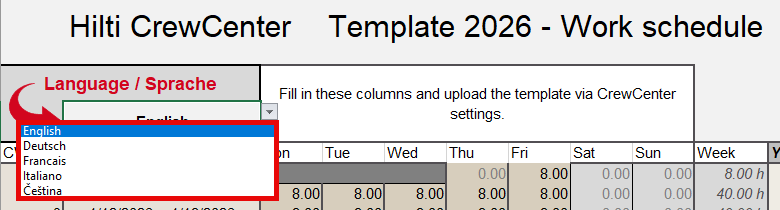 4. Otevřete soubor a vyplňte očekávané hodiny pro každý pracovní den v Excelu pro celý rok a nahrajte vyplněný Excel soubor.