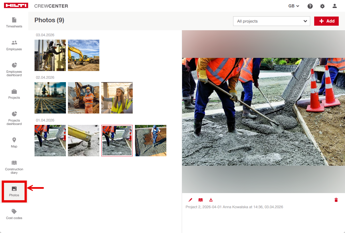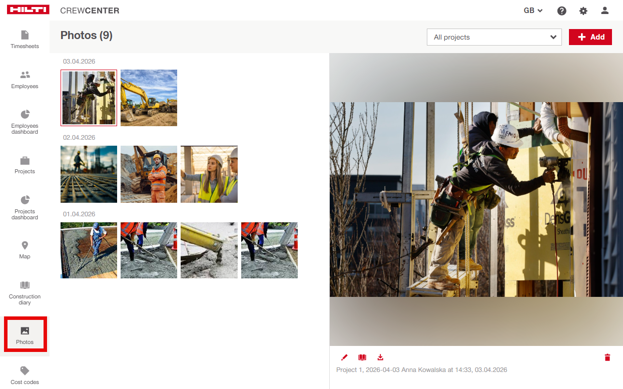 Knihovna fotografií v CrewCenter Web je centrální místo pro administrátory a supervizory, kde mohou spravovat, prohlížet a organizovat všechny fotografie související s projektem. Tato funkce podporuje dokumentaci, dodržování předpisů a reportování tím, že poskytuje snadný přístup k obrázkům nahraným jak z terénu, tak z kanceláře.