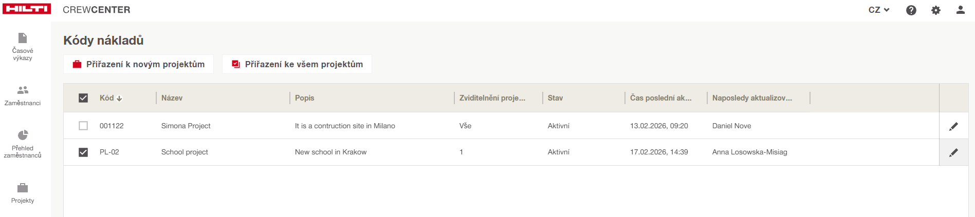 Nyní můžete najednou přiřadit více nákladových kódů jednomu nebo více projektům. To výrazně urychluje nastavení, zejména u projektů s dlouhými seznamy kódů, a zachovává všechny existující projektová přiřazení.