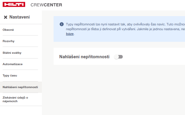 Pokud je v CrewCenter pro vaši společnost nebo tenanta vypnuto hlášení nepřítomností: