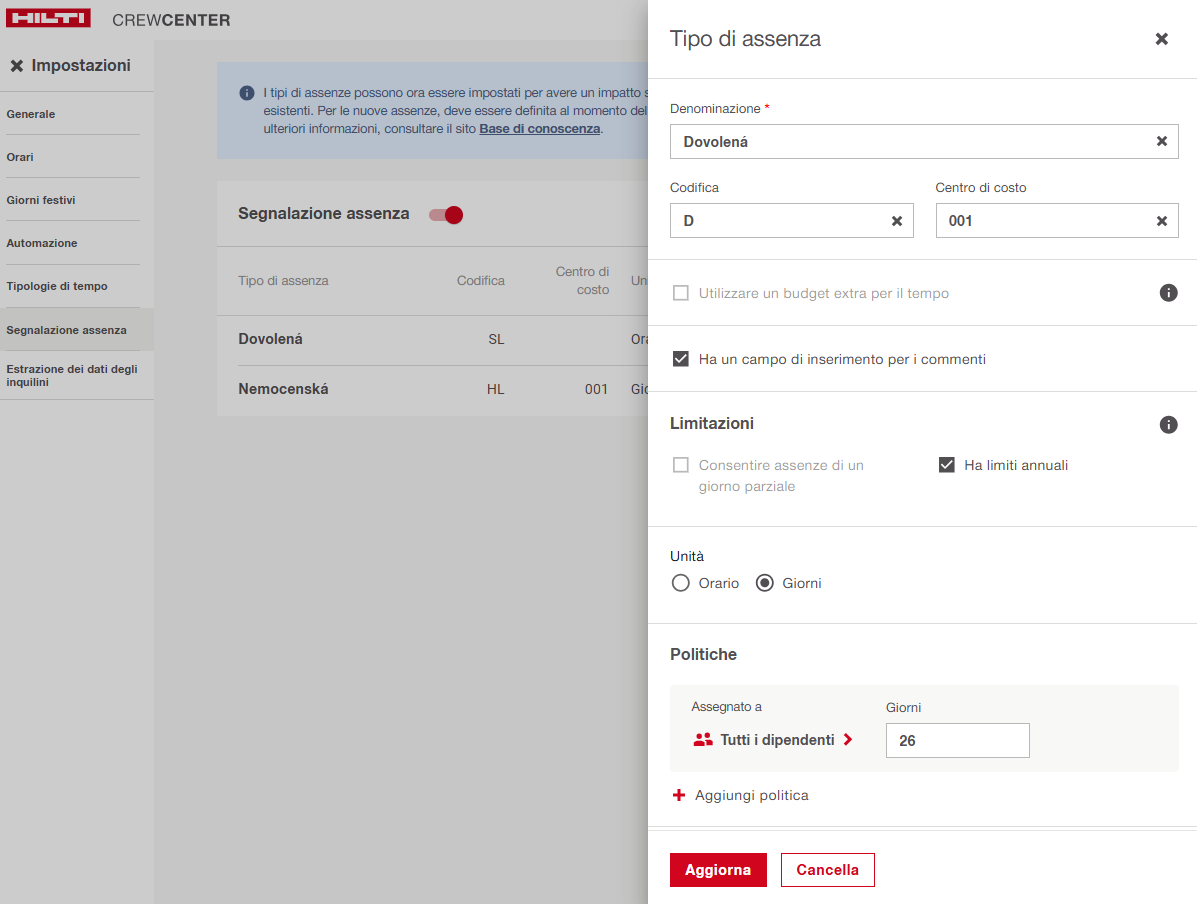 • Administrátoři mohou vždy vytvářet nebo upravovat nepřítomnosti, i když je roční limit překročen.