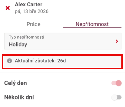 U jednoho zaměstnance aplikace nyní zobrazuje jeho zbývající zůstatek, pokud je vybrána omezená absence.