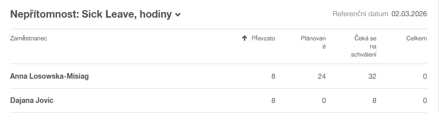 Dashboard zaměstnance nyní obsahuje nový widget zobrazující detaily absencí podle uživatele a typu. Zvýrazňuje již vyčerpaný čas (před referenčním datem), naplánovaný čas (po referenčním datu), čekající čas (dosud neschválený), dostupný čas (limit minus vyčerpané a naplánované) a celkový limit.