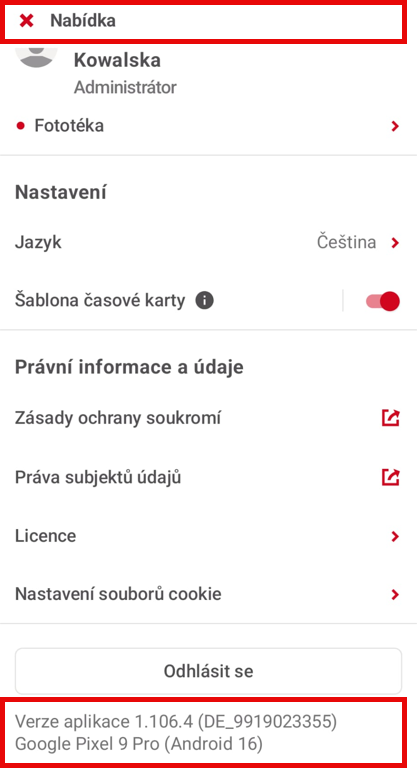 Příklad: Verze aplikace 2.63.0 (DE_0012345678) iphone (iOS26.3). Android zobrazí skutečné informace o modelu, např. Motorola edge plus.