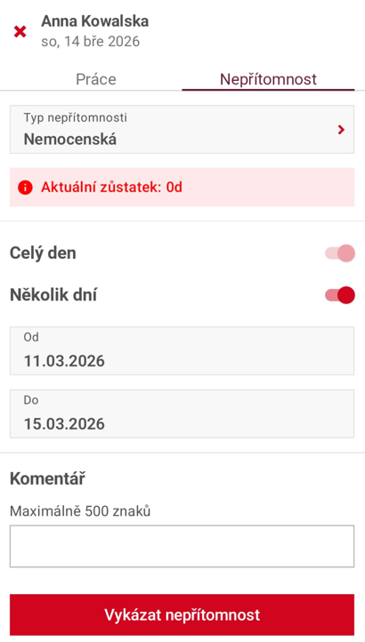 Mobilní prostředí pro vytváření absencí nyní obsahuje chytřejší filtrování typů absencí a jasnější viditelnost zůstatků, sladěnou s nastavením webu.