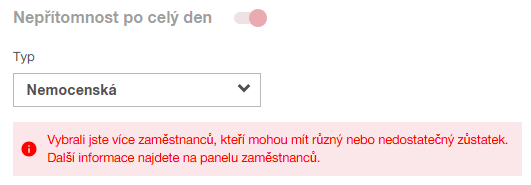 Zaměstnanci a vedoucí mohou absenci vytvořit pouze tehdy, pokud jsou vybrané dny v rámci dostupného zůstatku.