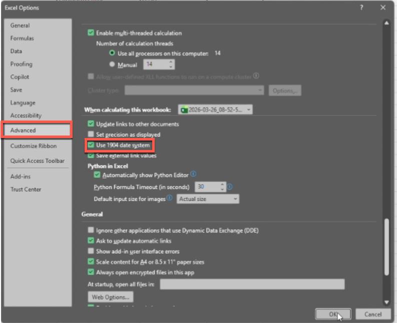Sjeďte dolů k možnostem "Při výpočtu sešitů" a zaškrtněte Použít systém dat 1904