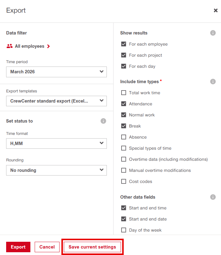 CrewCenter nyní pamatuje vaše nastavení exportu pro každou šablonu. To zahrnuje předvolby jako formáty času, možnosti zaokrouhlování a která datová pole zahrnout. Při budoucím exportu dat bude dialog exportu předvyplněn vašimi předchozími volbami, což šetří čas a snižuje manuální zadávání.