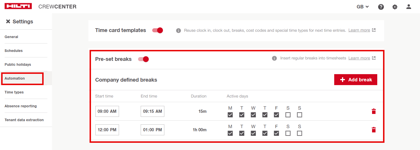 Administrátoři mohou aktivovat a konfigurovat celofiremní přednastavené přestávky pomocí webového rozhraní. Uživatelé si mohou vybrat mezi firemními, osobními nebo zakázáním přednastavených přestávek. Přednastavené přestávky jsou automaticky přidávány do docházkových lístků a ověřovány, aby se zabránilo překrývání, což zajišťuje dodržování firemních politik.