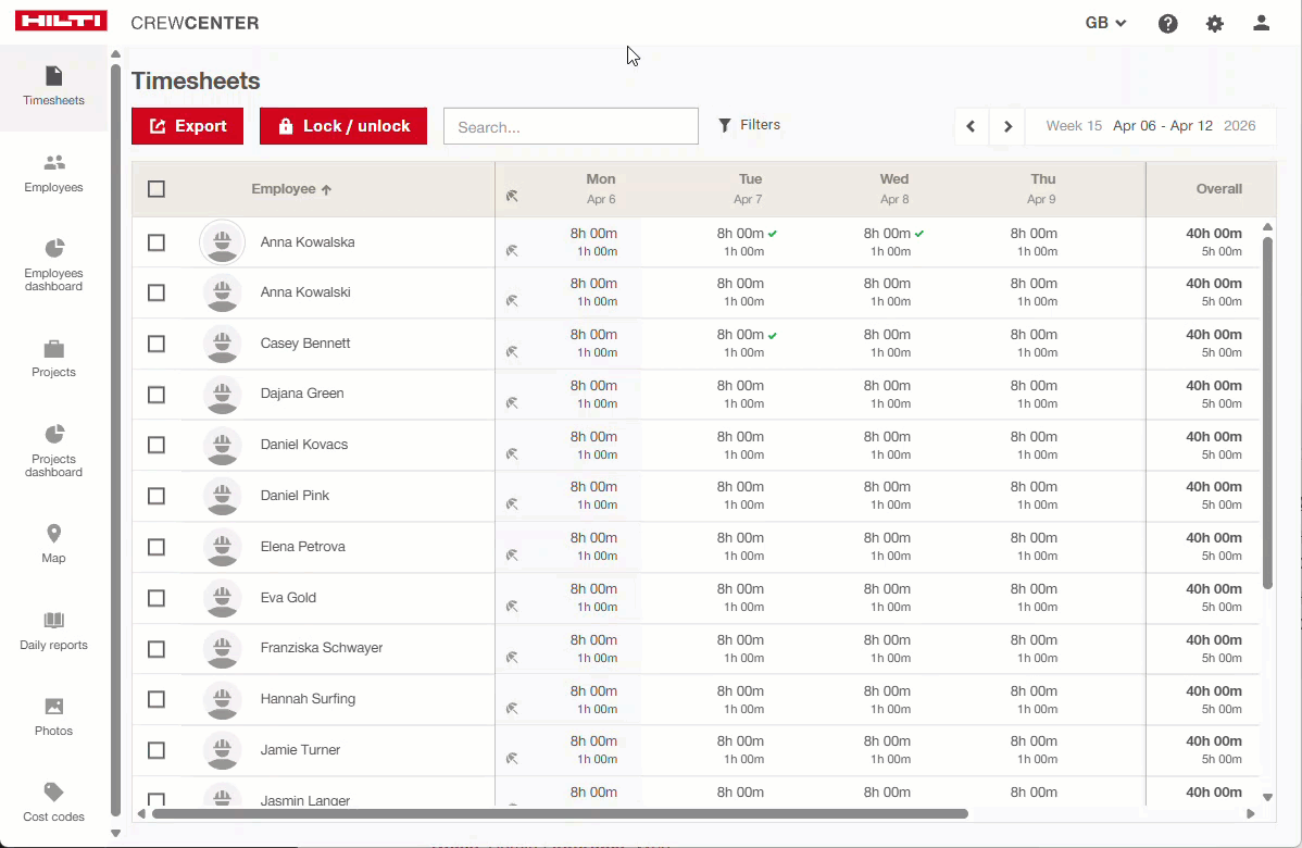 V záložce Employees zkontrolujte ikony schválení vedle každého zaměstnance: