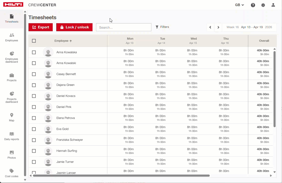 Otevřete aplikaci CrewCenter a přejděte na záložku Timesheet.