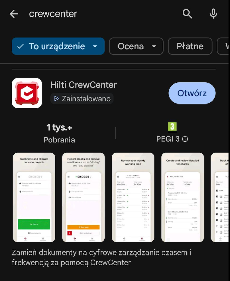 Suchen Sie direkt im Google Play Store oder Apple App Store nach „Hilti CrewCenter“, wie unten gezeigt: