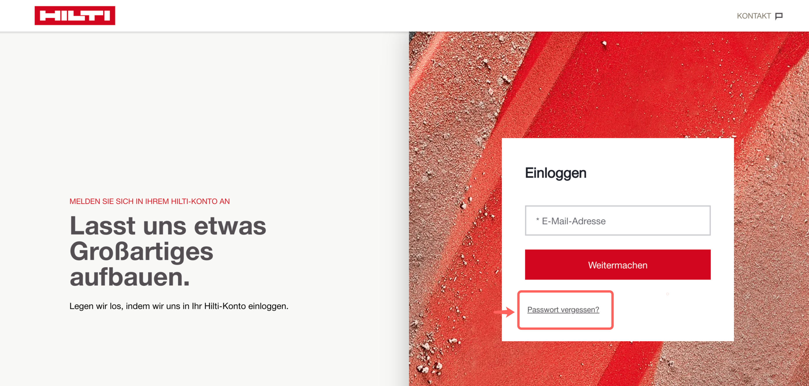 Wenn Sie Ihr Passwort vergessen haben und Ihr Passwort für Ihre Hilti-Anmeldedaten zurücksetzen möchten, führen Sie die folgenden Schritte aus: