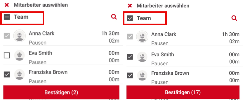 Tippen Sie unten auf dem Bildschirm auf "Bestätigen", um die Zeiterfassung für die ausgewählten Teammitglieder zu starten.
