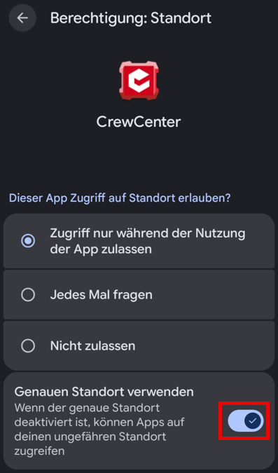 Wenn die Berechtigung verweigert wird, kann CrewCenter jedoch nicht auf den Standort Ihres Geräts zugreifen oder diesen teilen.