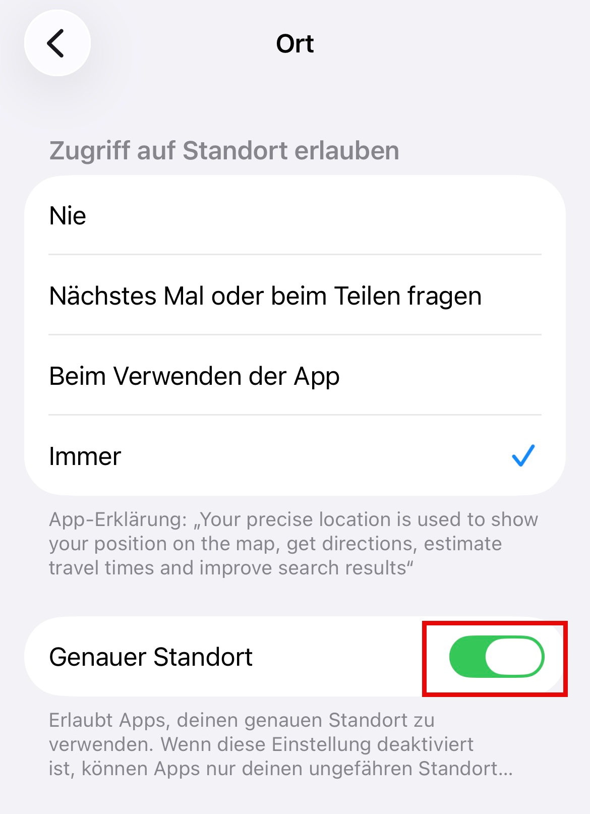 - Wählen Sie „Immer“ (empfohlen) oder „Beim Verwenden der App“. Stellen Sie sicher, dass der genaue Standort aktiviert ist.