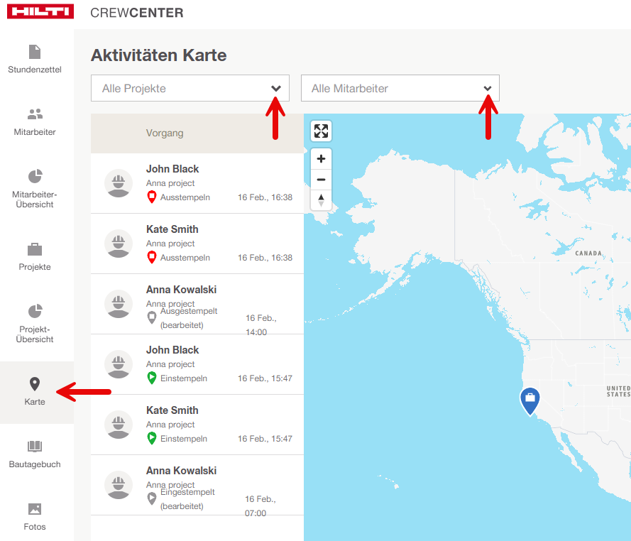 - Wählen Sie das gewünschte Projekt und den Mitarbeiter aus, um deren Standorte zu Arbeitsbeginn- und Arbeitsende anzuzeigen.