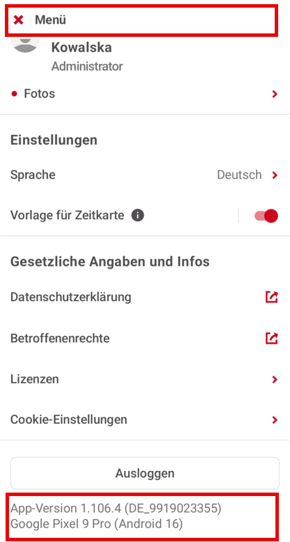 Die App-Version am unteren Rand des Menüs enthält nun kontextbezogene Kennungen: