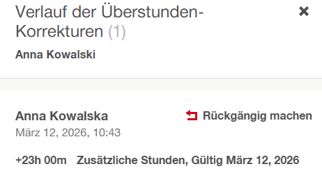 Administratoren können nun eine manuelle Mehrzeitkorrektur direkt aus der Historie der Mehrzeitkorrekturen entfernen. Nach Bestätigung des Rückgängigmachens verschwindet der Eintrag und das Überstundenguthaben des Mitarbeiters wird automatisch neu berechnet.