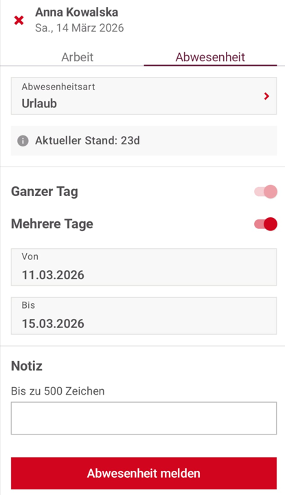 Das mobile Abwesenheitserstellungserlebnis bietet jetzt eine intelligentere Filterung der Abwesenheitstypen und eine klarere Sichtbarkeit der Guthaben, abgestimmt auf die Web-Einstellungen.