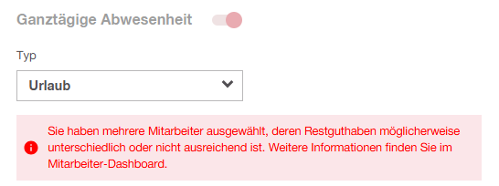 Bei Massenaktionen mit begrenzten Abwesenheiten sehen Administratoren eine rote Warnung: