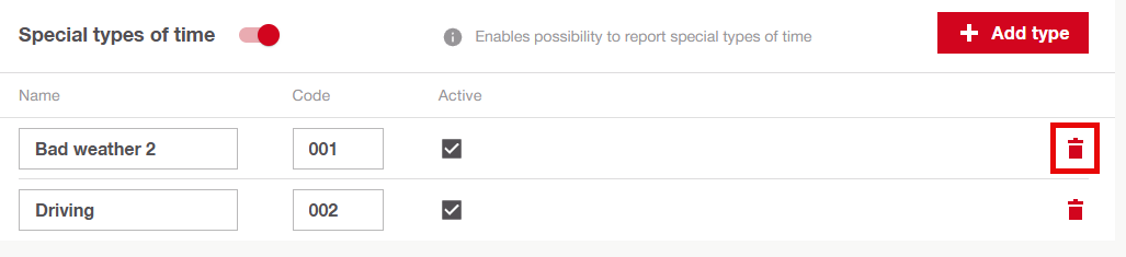 Um eine neue Sonderbedingung zu erstellen (z. B. Fahrt, Schlechtes Wetter), muss der Administrator auf Typ hinzufügen klicken. Es erscheint eine neue Zeile, in der Name und Code für den neuen Typ eingegeben werden können.