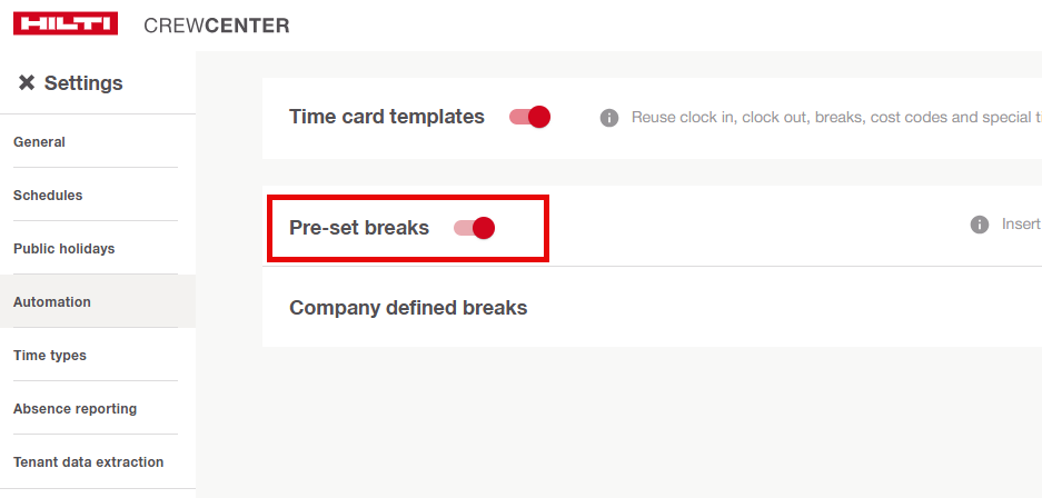 When enabled, breaks appear automatically for the selected days and times, based on user or company settings.