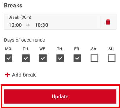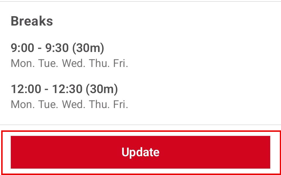 Any changes to company-defined breaks are highlighted in the app settings with a red dot.