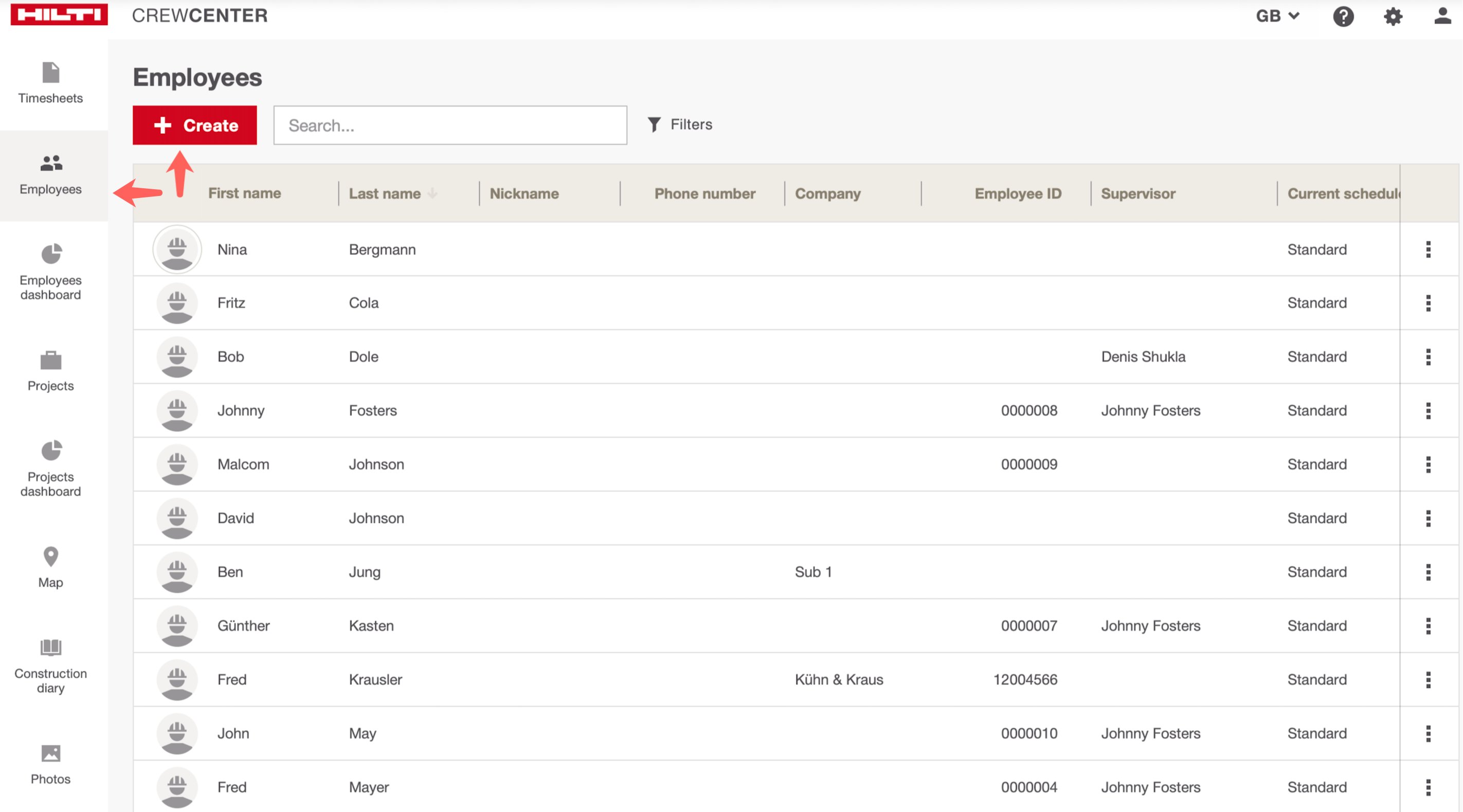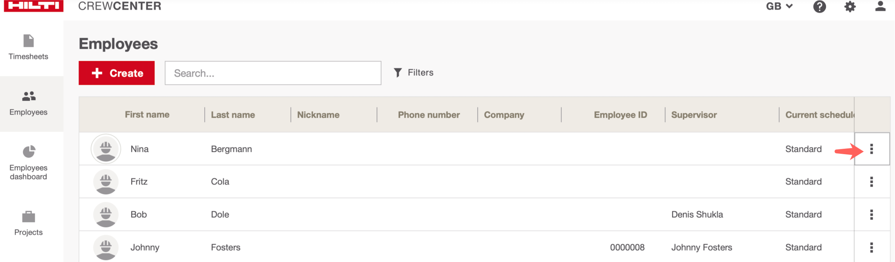 Step 1: Go to the “Employees” tab on the left side of the screen and hover over the “+Create” button, then select “Create” to add employees manually.