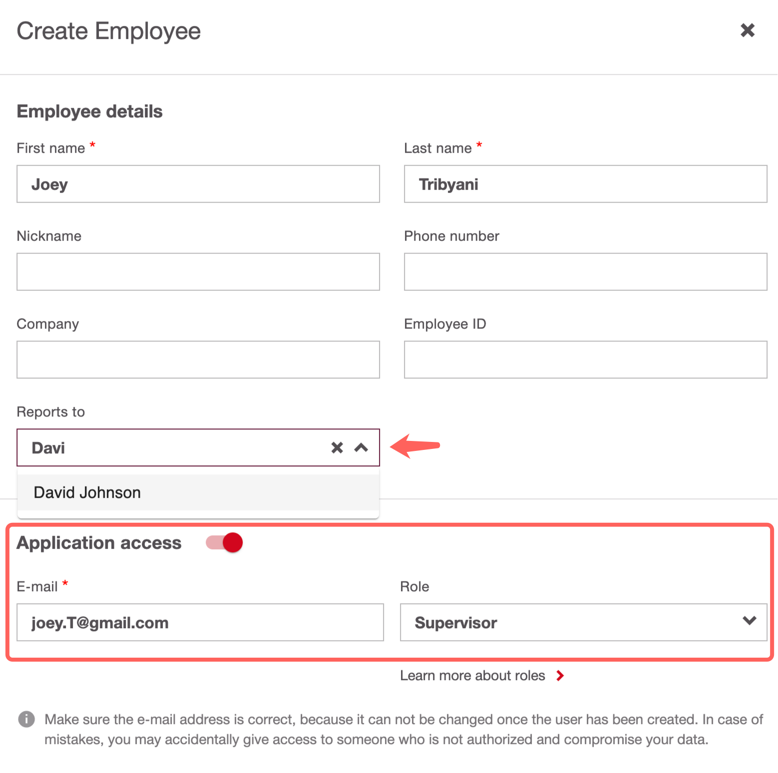 - If you want to create an Employee with “Admin” or “Supervisor” Role, you must always grant "Application access".
