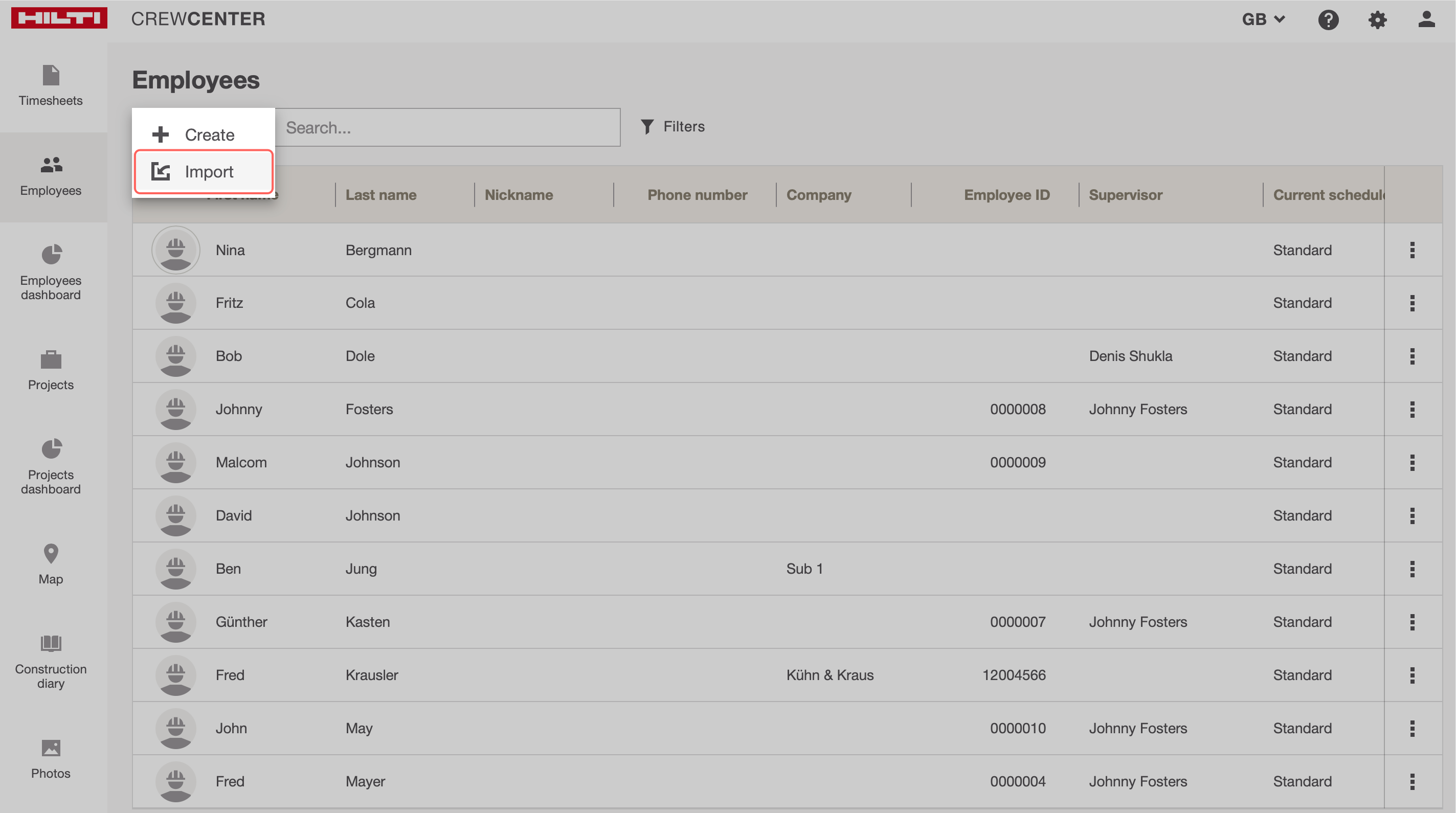 Step 1: Click on "Employees" and hover over the “+Create” button, then select “Import” to import Employees via CSV file.