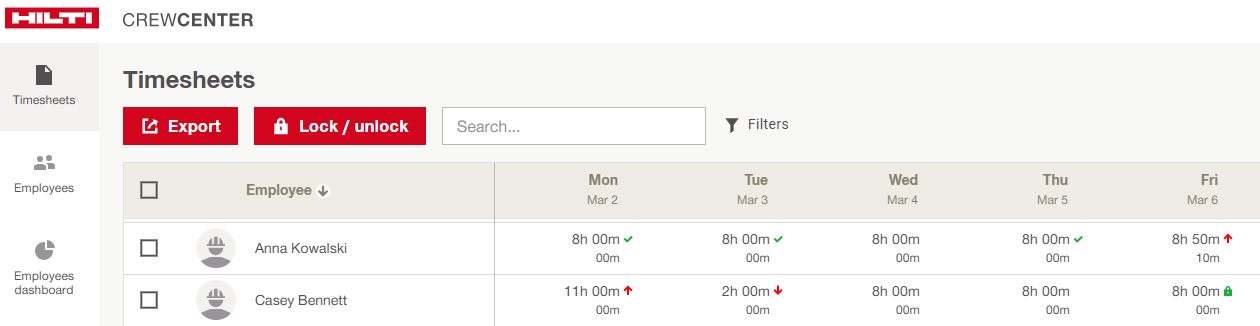 The Timesheets tab in CrewCenter provides a week view of time entries for each employee. Various icons and highlights help users quickly identify the status of time entries and spot deviations from planned work or breaks.