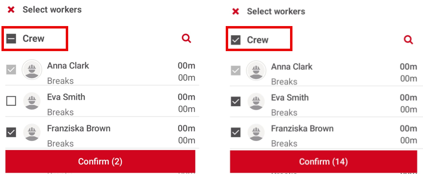 All subsequent actions (breaks, comments, special conditions) apply to all selected workers.