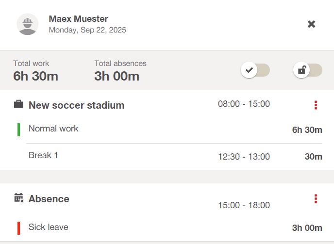 - Timecard summary now clearly shows the actual working time - absences are no longer included in the total work calculation. Absences are now displayed separately to understand real working hours and time off at a glance.