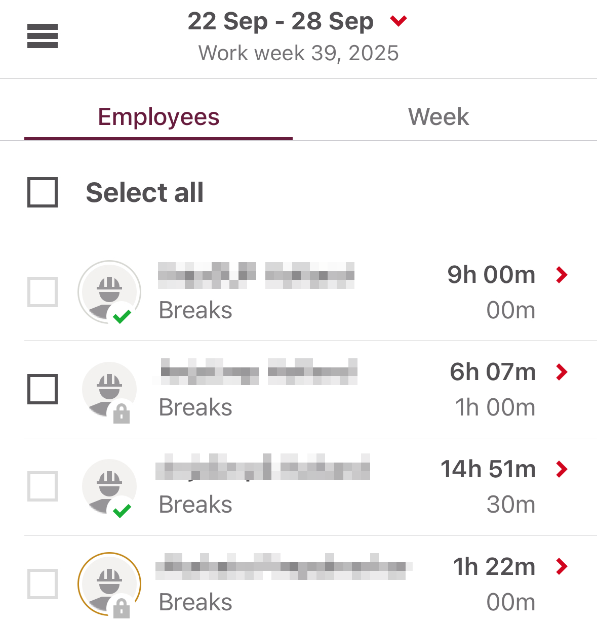 Supervisors and Admin can see a partial lock indicator (grey lock icon) in the timesheet tab on an employee level if their week is only partially locked and on a day if not all employees’ timesheets for that day are locked.