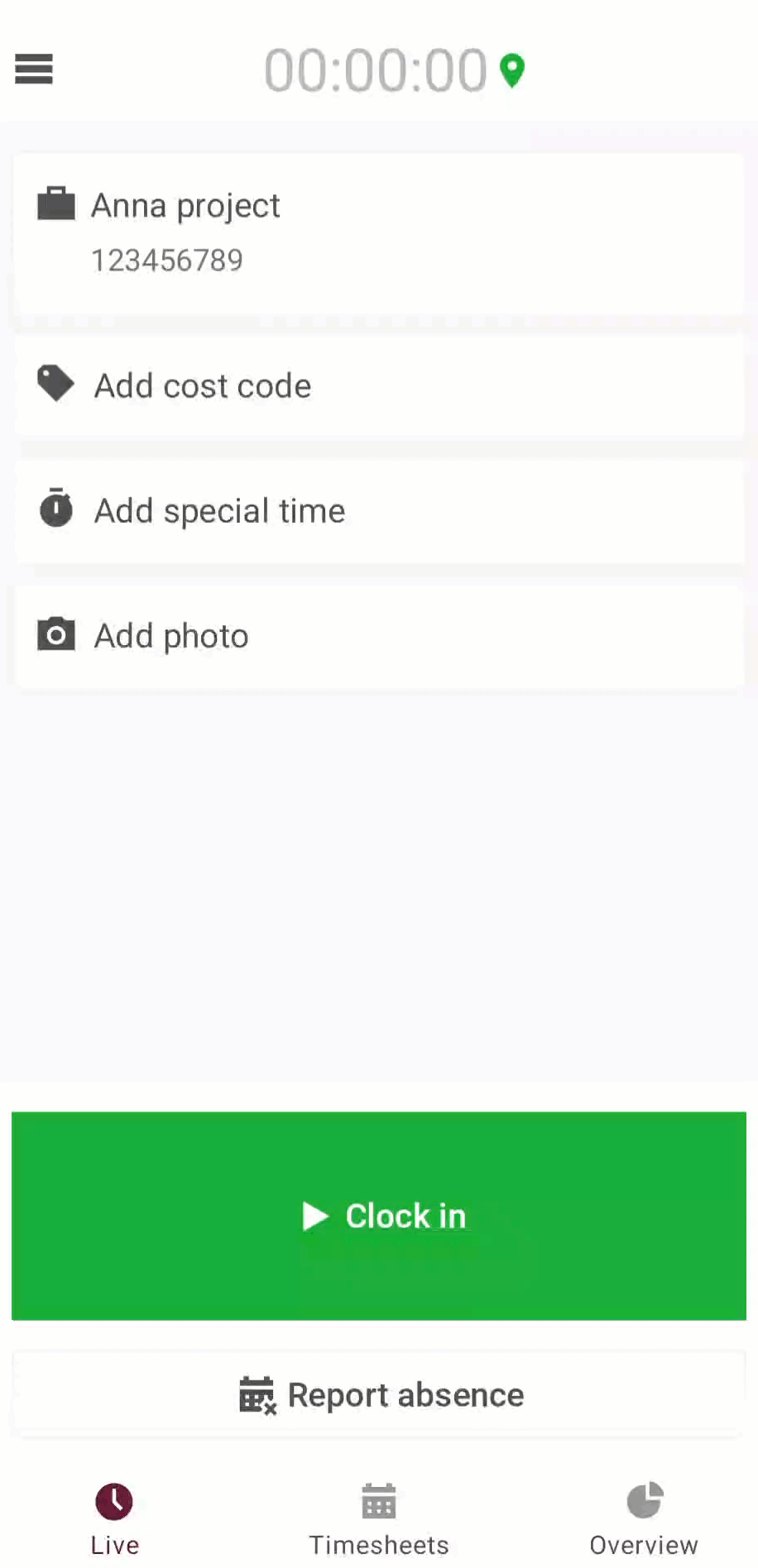 Fill in the required details for your time entry eg. Project, Click-in and Clock-out, Breaks, Special time Types and Add time entry.