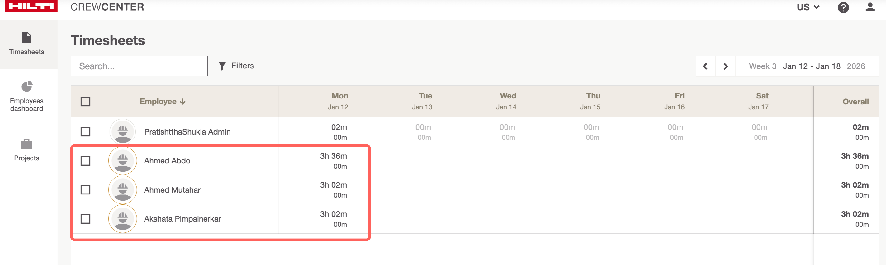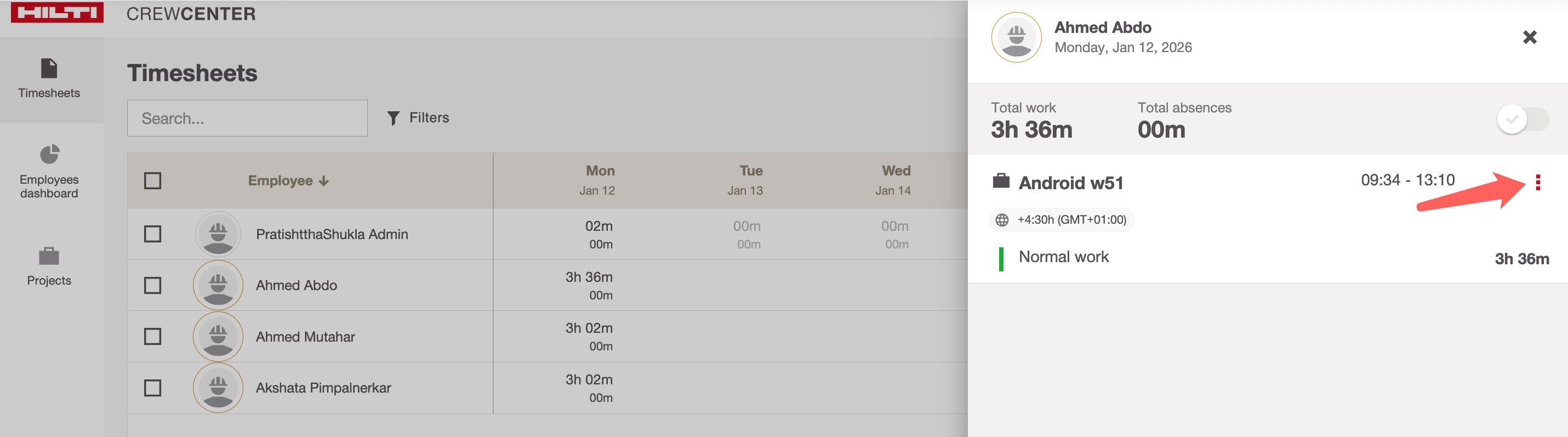 Find the jumper worker in the list (they appear where they have time or can have time on that jobsite).