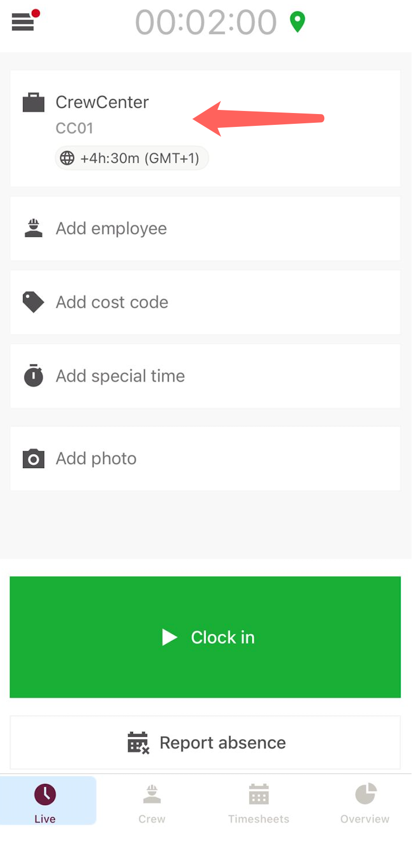 Tap Clock in to start live tracking.