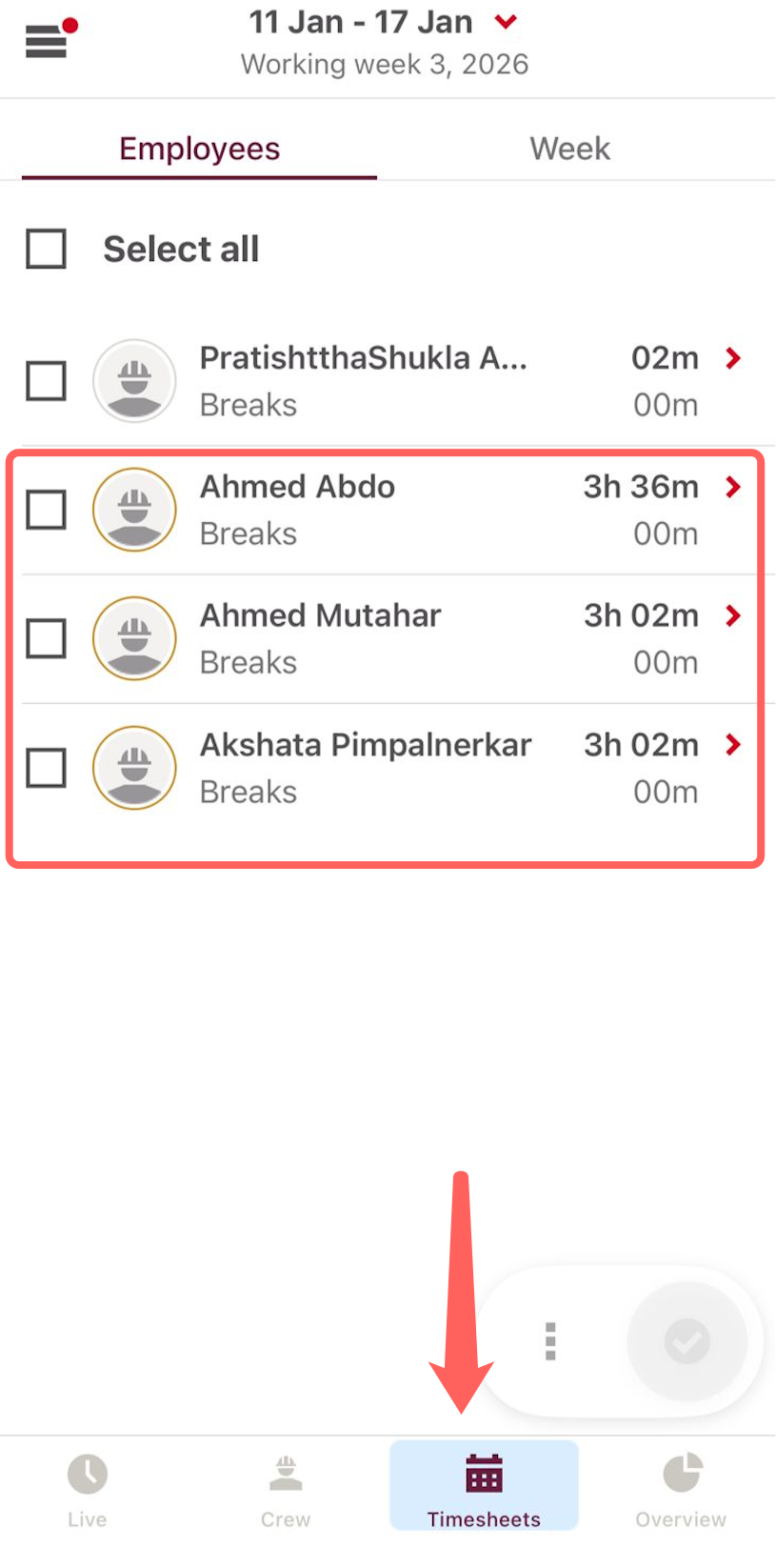 Open the CrewCenter App and navigate Timesheet tab.