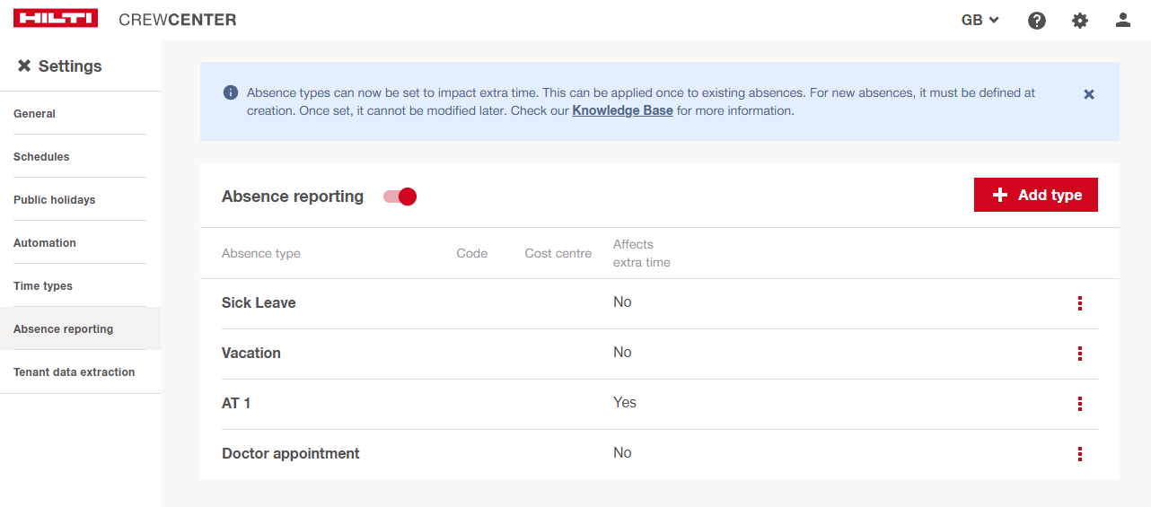 - Easier absence type management - Administrators can now create and manage absence types more efficiently through a redesigned side panel. The updated interface includes an improved grid layout and a convenient 3‑dot menu for quick editing and deletion of individual absence types.