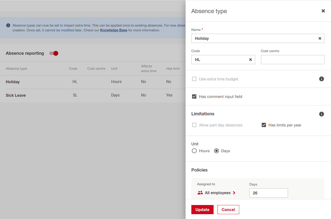 Admins can exceed absence limits when creating or editing absences, both for single and multiple employees.