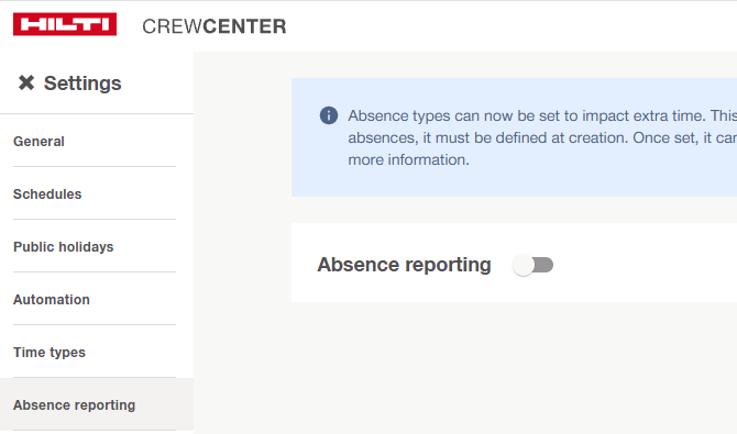 If absence reporting is disabled for your company or tenant in CrewCenter: