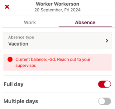 Supervisors can only create the absence when selected days are within the available balance.